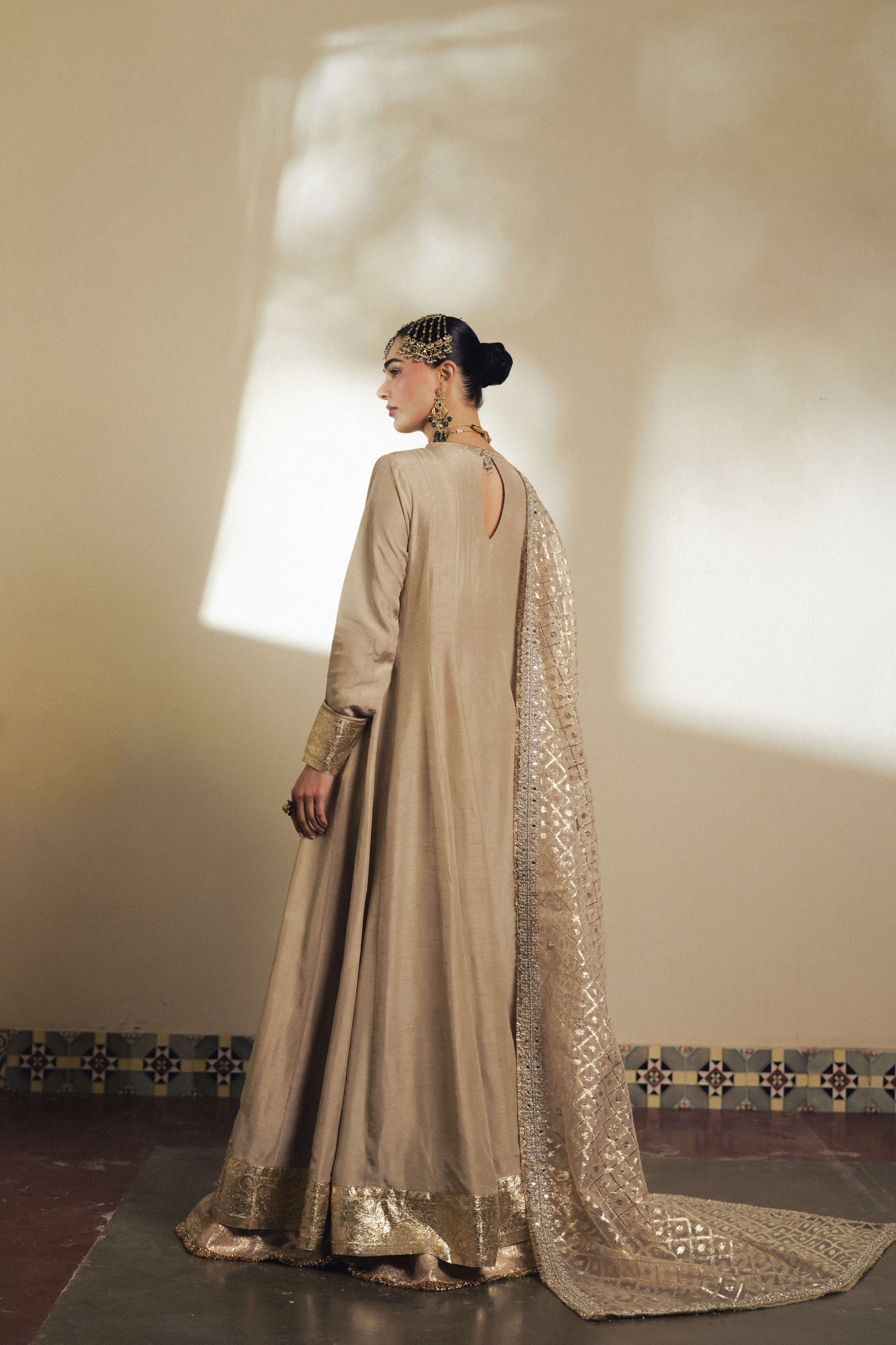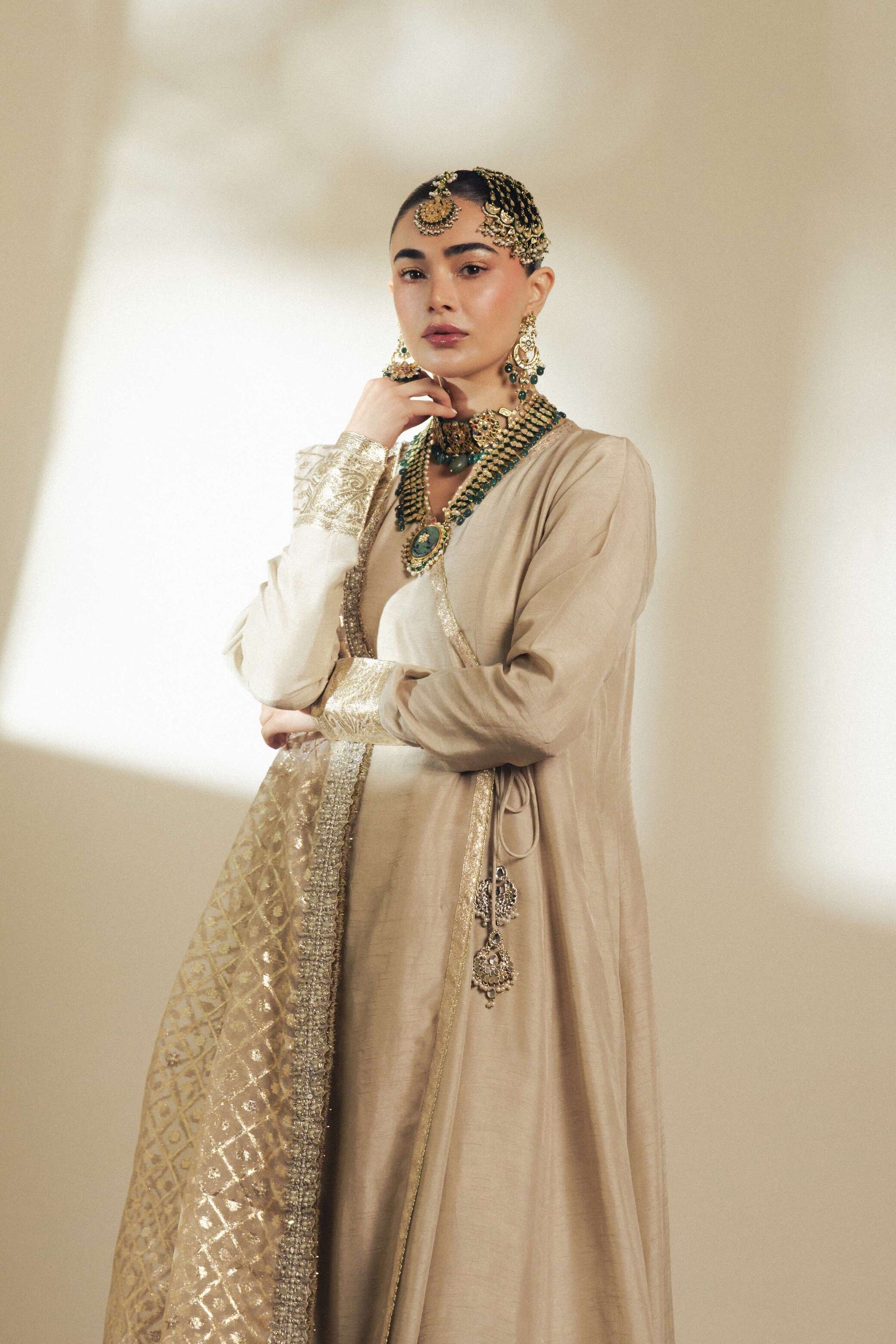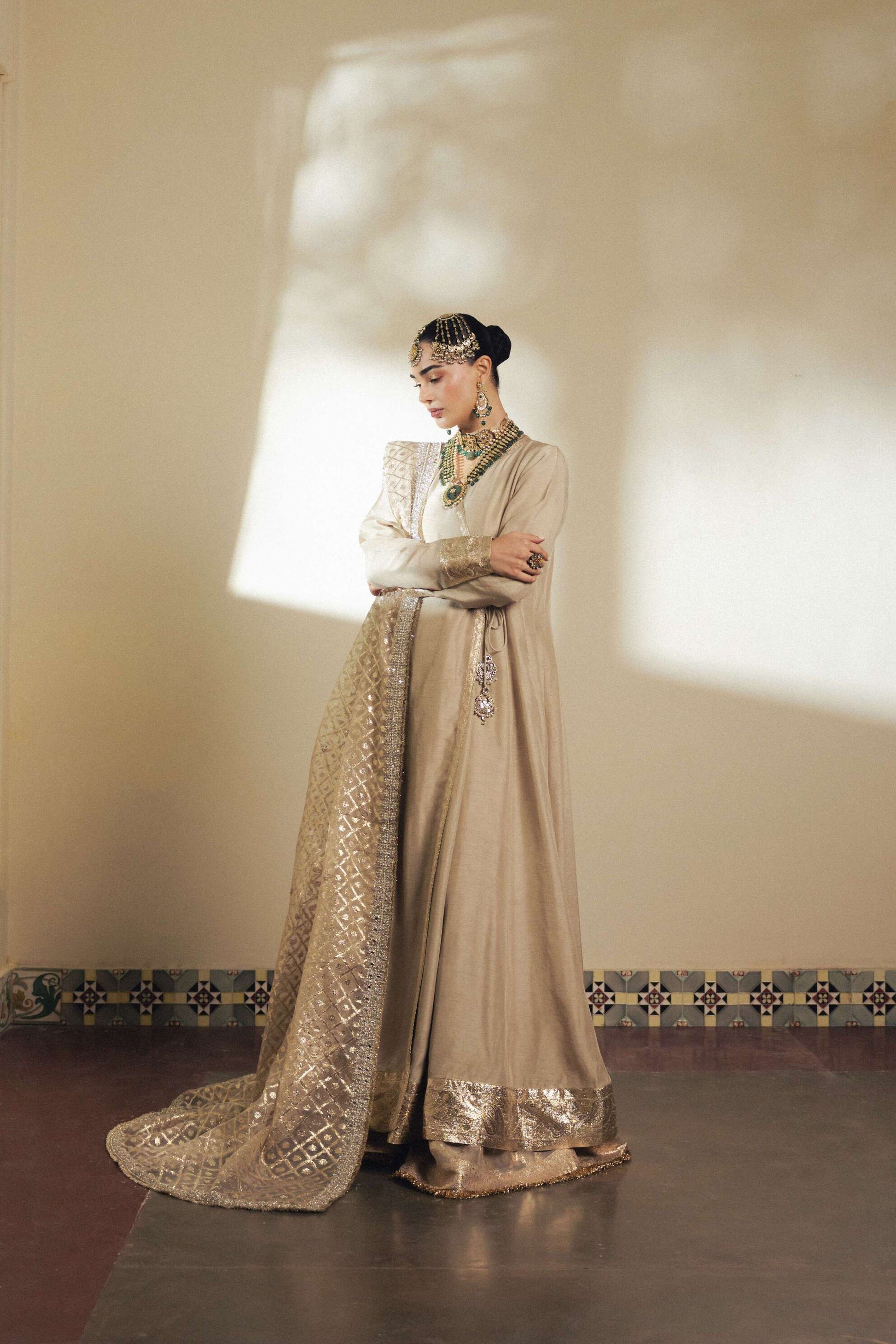 Kalidaar Angarkha; Farshi Sharara; Dubatta Silk Kalidaar Angarkha, wrap-around style tied at the side, with silk strings edged off with Kundan Jhumka Tassels, draped with a pure Kundan Zari Badla Organza Dubatta, with silver Zardozi, Pearl and Sheesha hand embellished borders paired with Chanderi Silk Farshi Sharara pants.