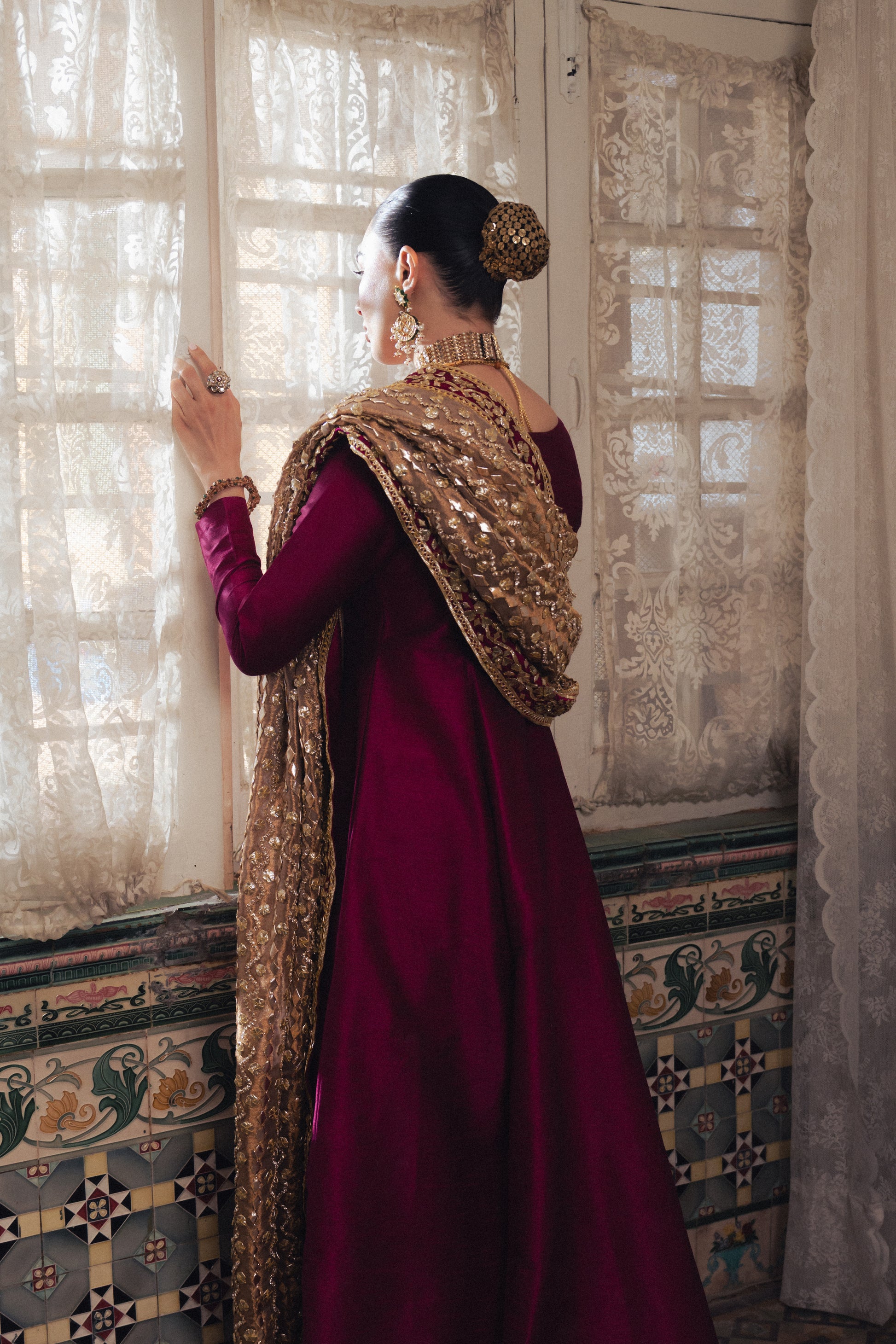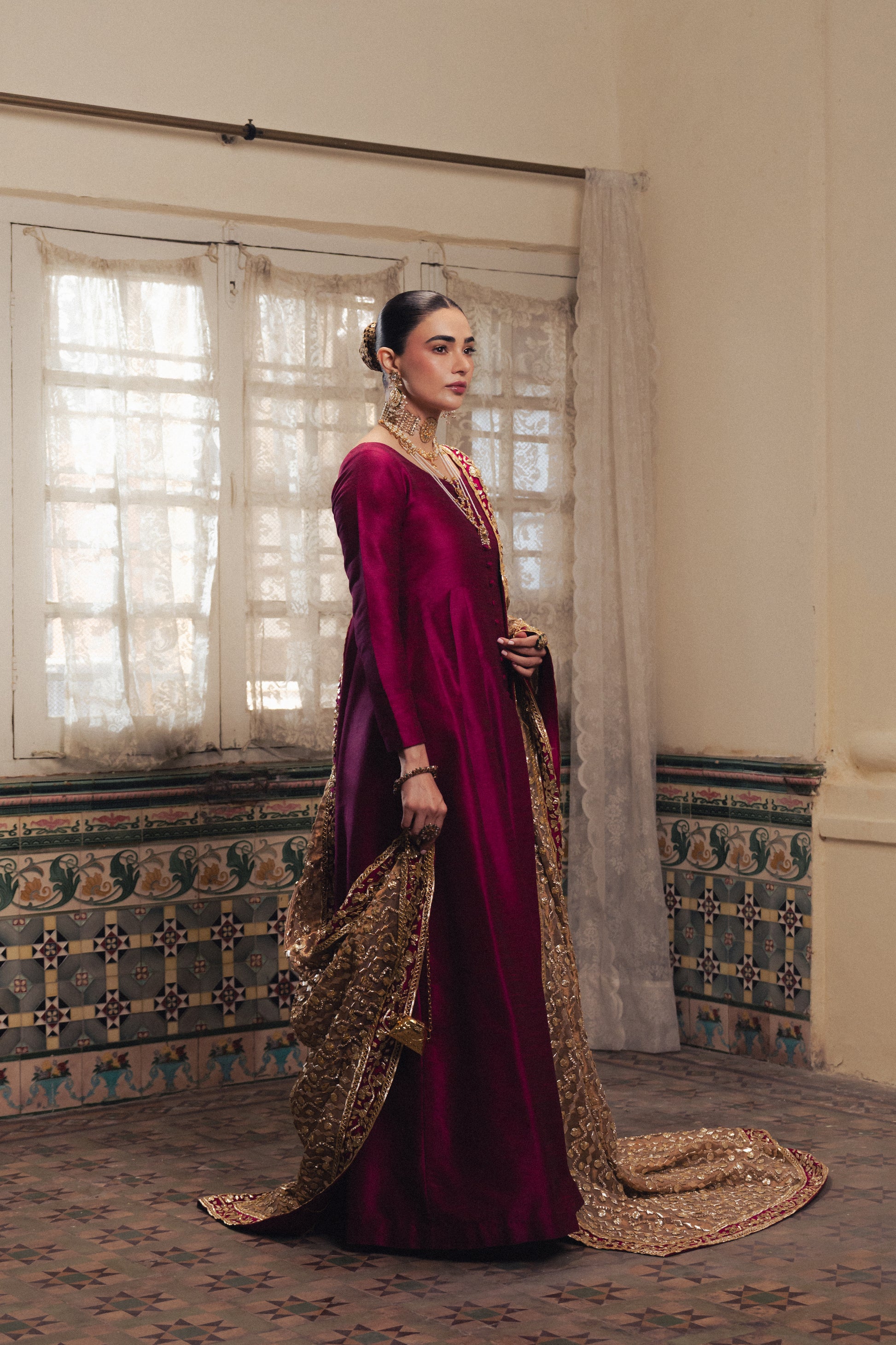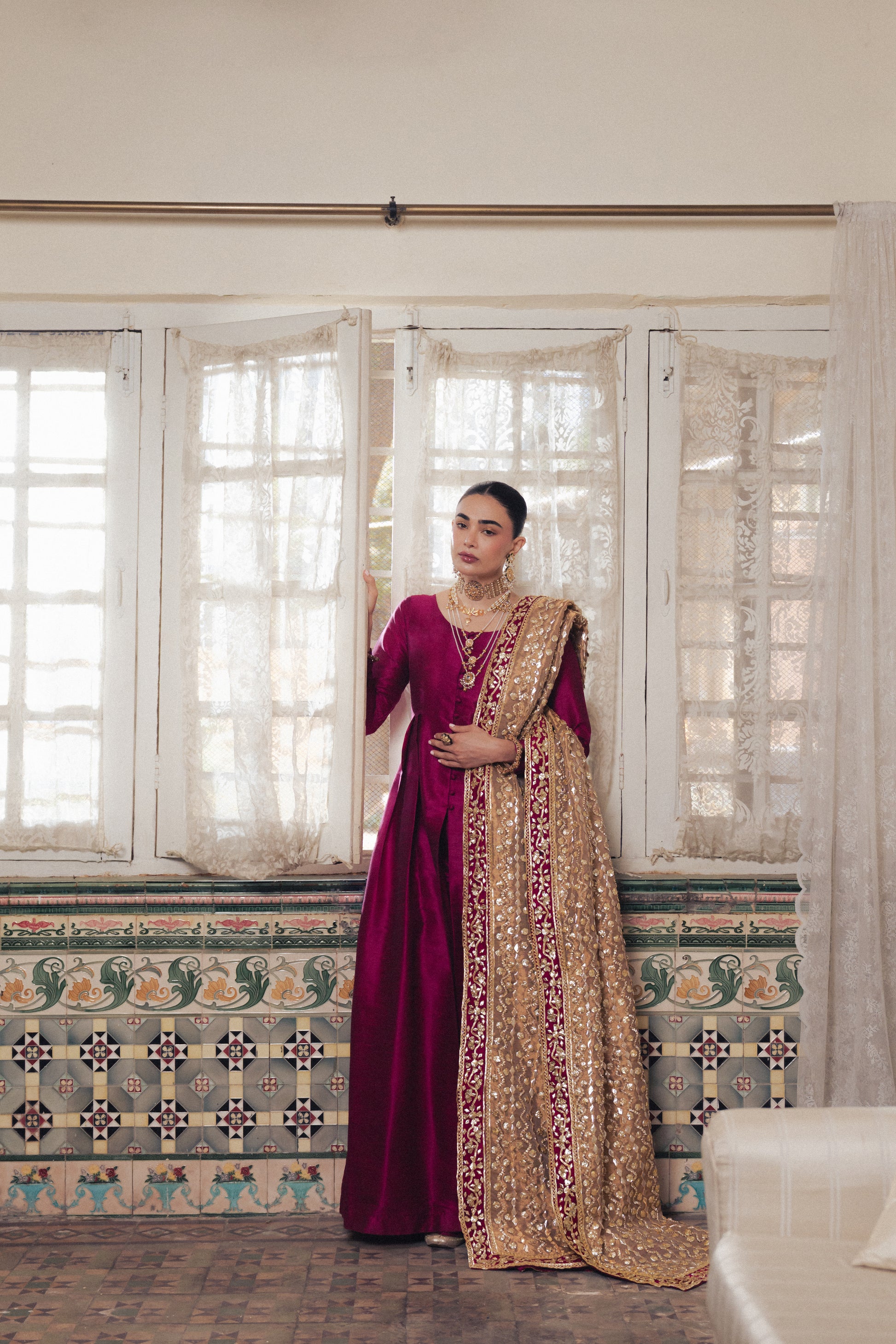A deep plum Silk front-open panelled shirt, paired with matching silk Farshi Izaar; floor sweeping flared trouser. The stunning Dubatta is made in gold Double Zari pure Tissue, heavily embellished with authentic Gotta Patti, Gotta Phool, Gotta Tukdi and Gotta Panni Jaal.