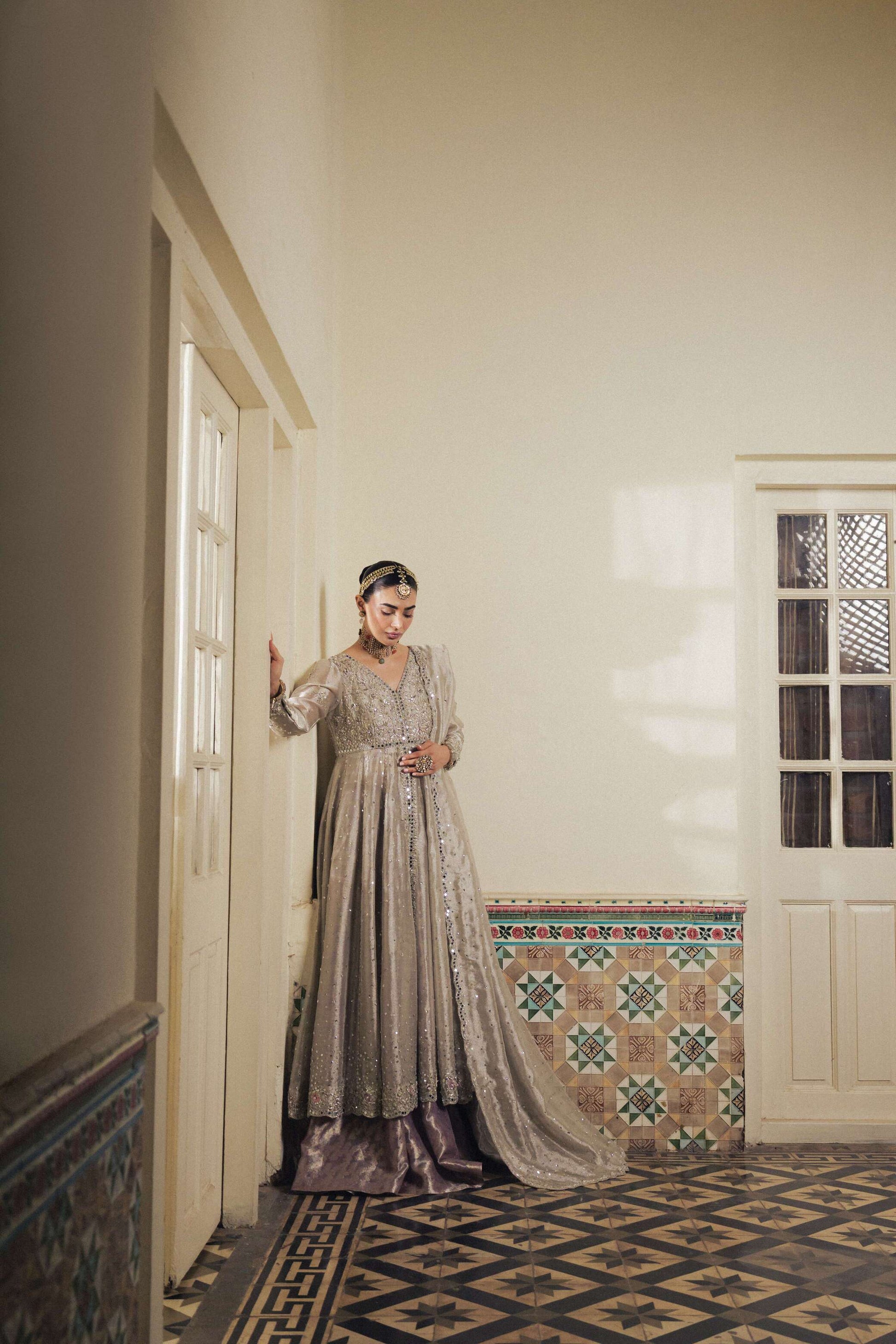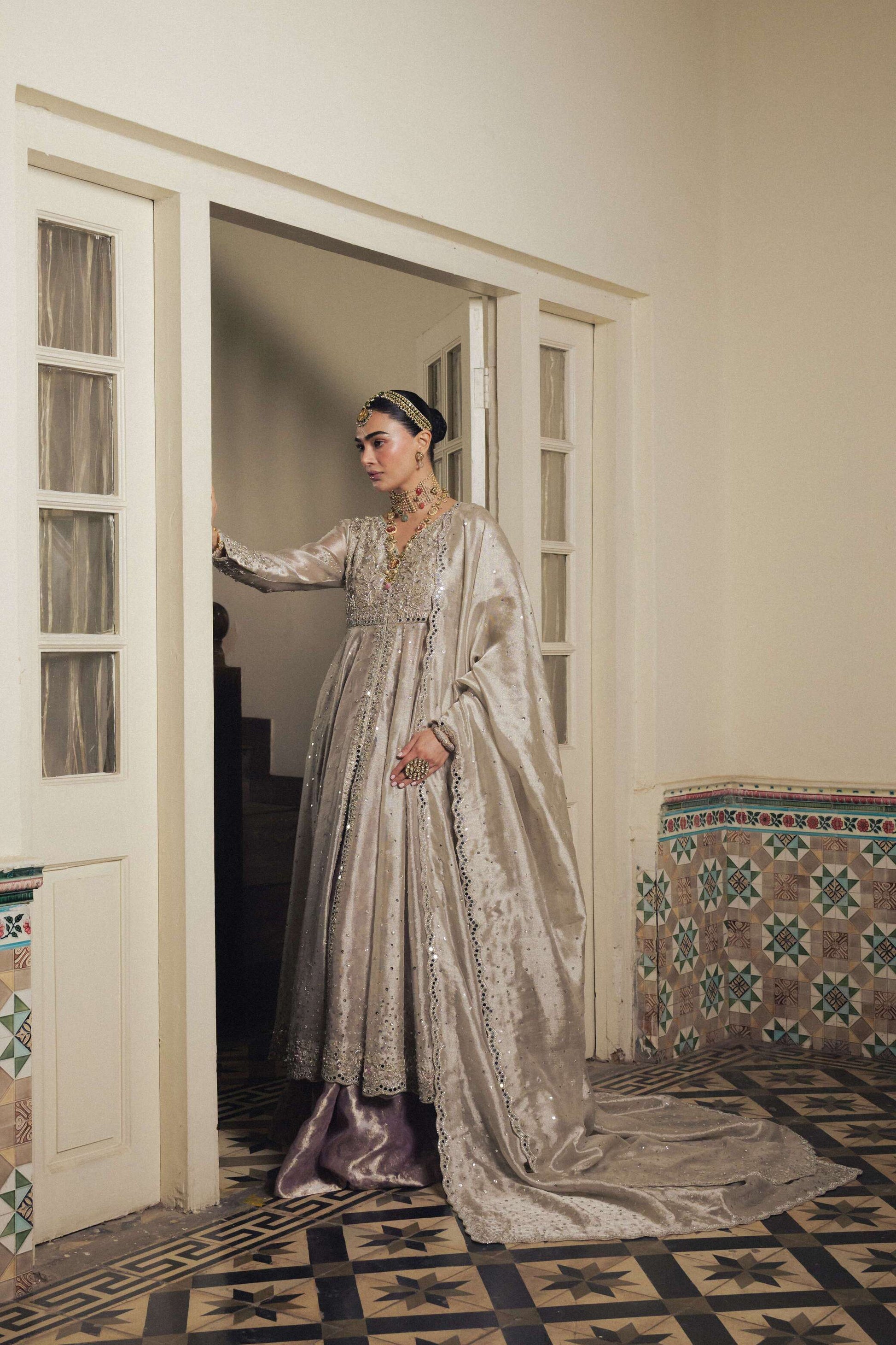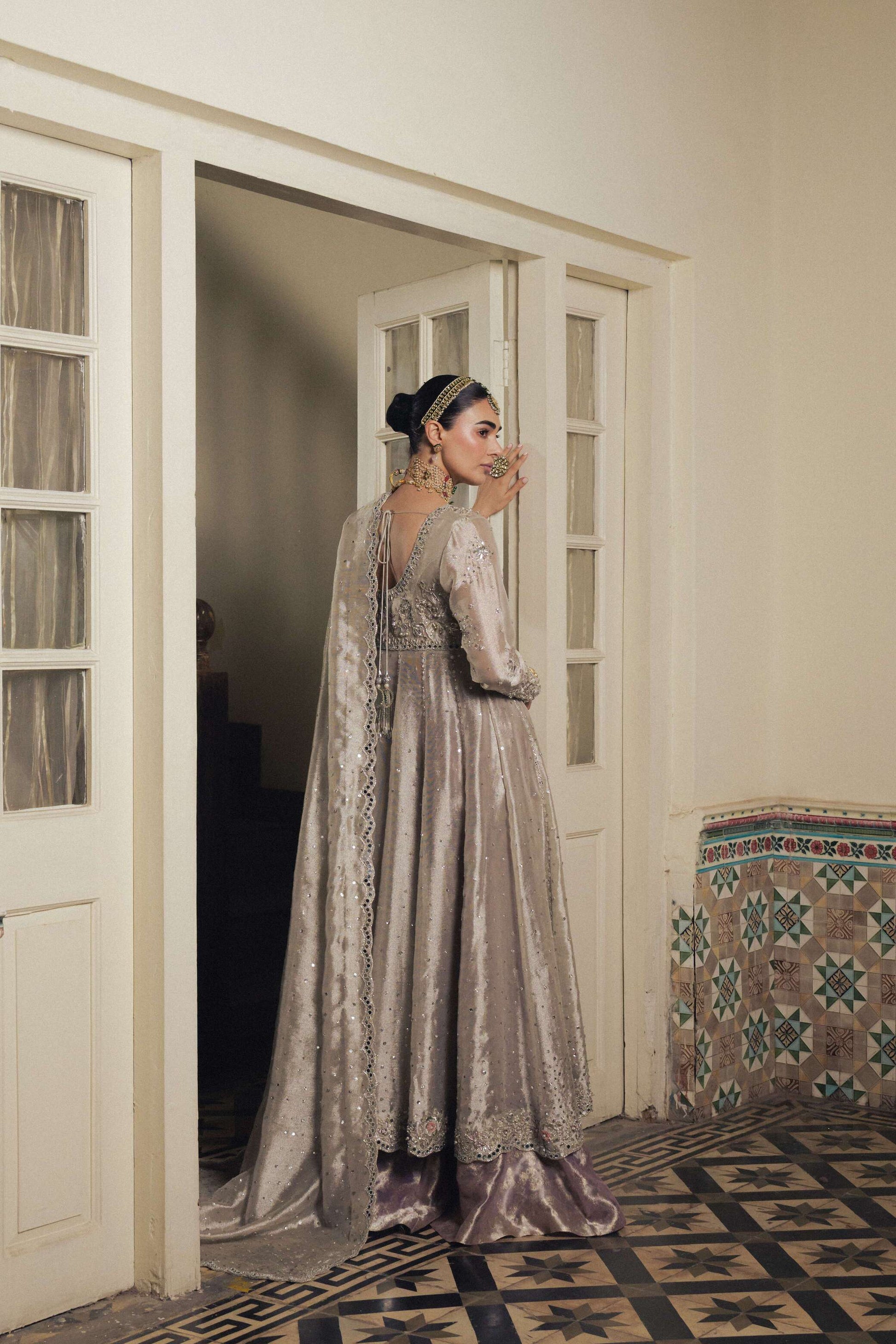 Silver Double Zari pure Tissue Kalidaar (panelled, flared front-open dress) embellished with Silver Zardozi (Metallic Dabka, Pearl, Sheesha, Bethki) paired with a hand embellished mirror-worked scalloped pure Double Zari Tissue Dubatta, with a Lavender pure Brocade Tissue Lehnga, lined with silk.