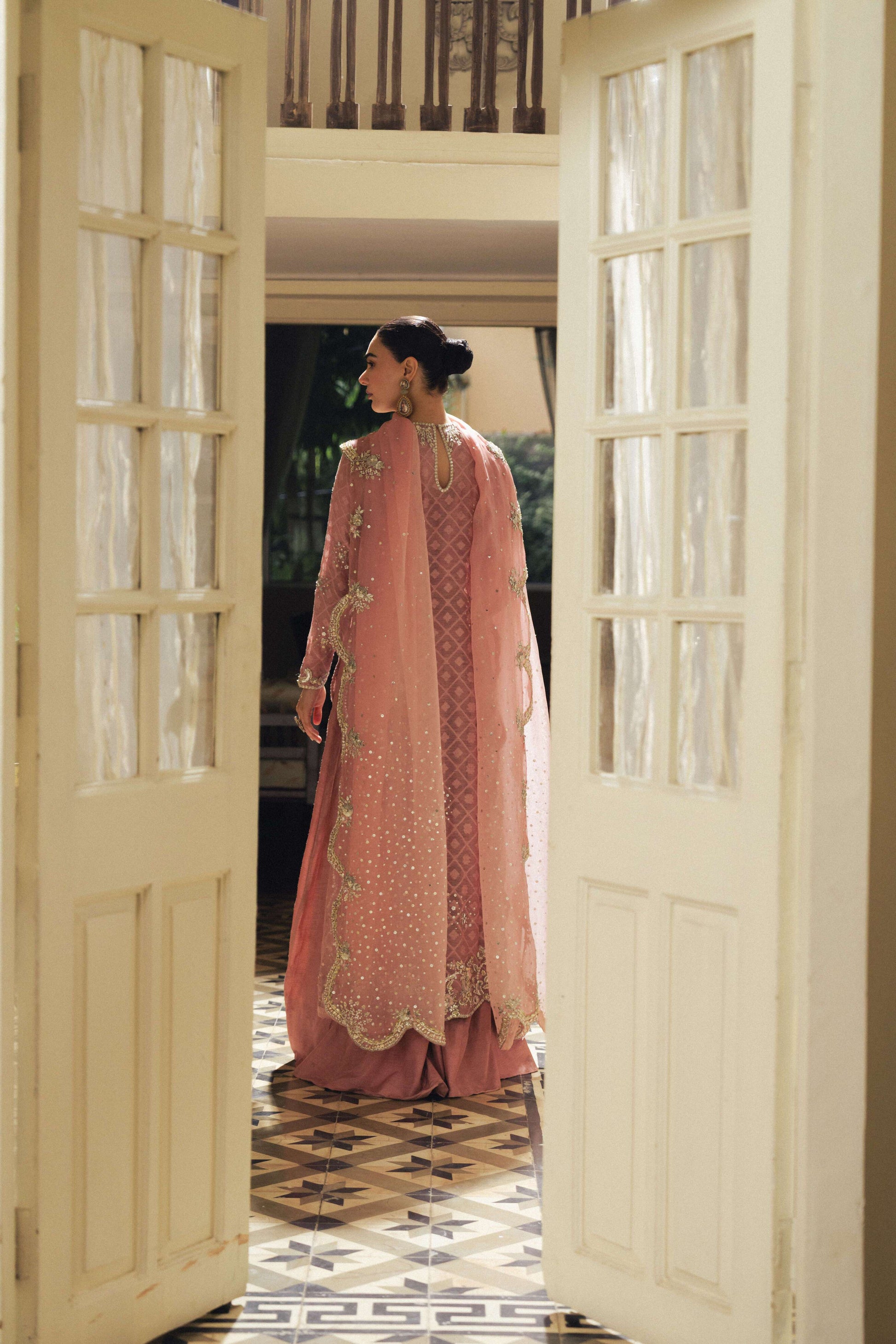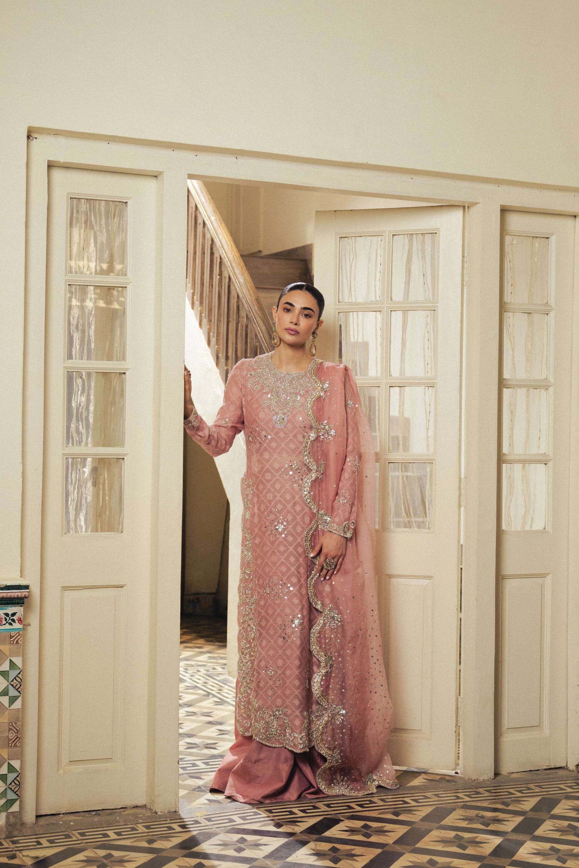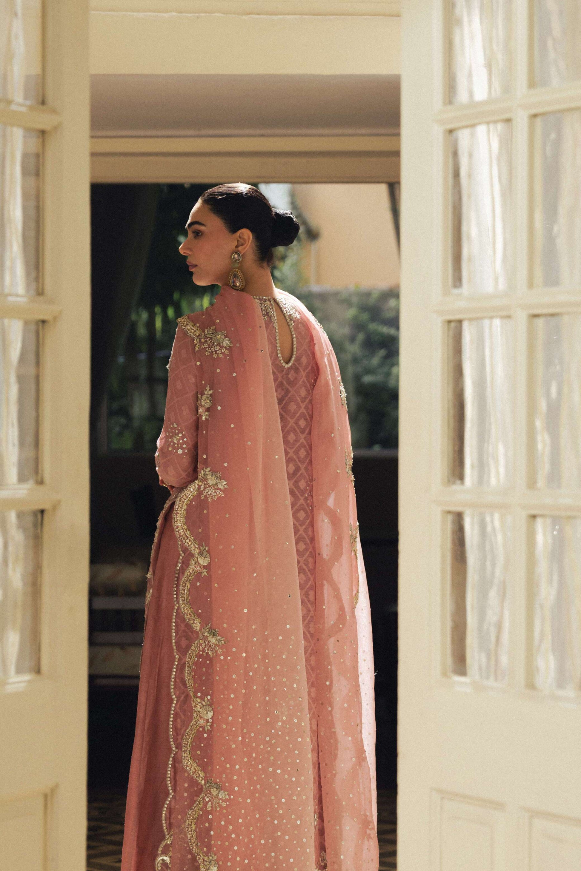 A silver encrusted jewel inspired neckline, featuring Silver Zardozi hand embellishments, incorporating Silver Dabka, Bethki, Pearl, Silver Mukaish and Pink Silk Resham thread. A pure Silk Net scalloped shirt, styled with a Pure Kattan Organza hand-embellished scalloped Dubatta, featuring a silk high-waisted floor sweeping flared pants.